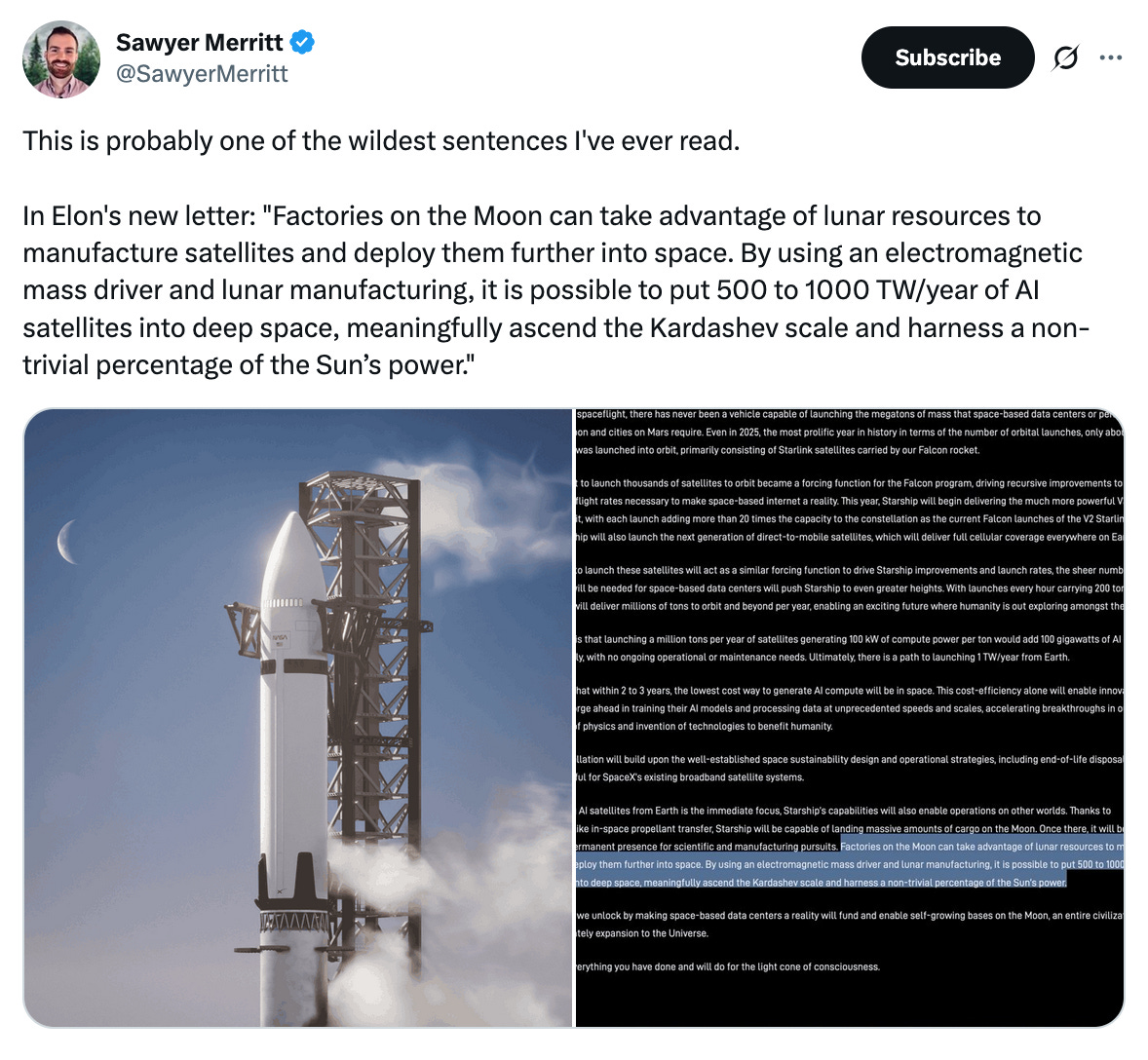 Maybe. In fact, over time there’s a good chance that something like this may happen. But technological predictions are typically overoptimistic in the short term, and insufficiently visionary in the long term. Elon Musk’s rockets will be introduced over years. Even for SpaceX, rocket development takes time, and quite a few explosions along the way. That’s not to downplay the degree of the change: In my Space Law class last year we did some modeling of how fast you could build a mammoth space station using AI to control fleets of robots only modestly more capable than Tesla’s Optimus robot that’s being demonstrated now. The answer is, very fast. Likewise moon bases and mass drivers. But I doubt we’ll be doing that in 2030, or 2035.