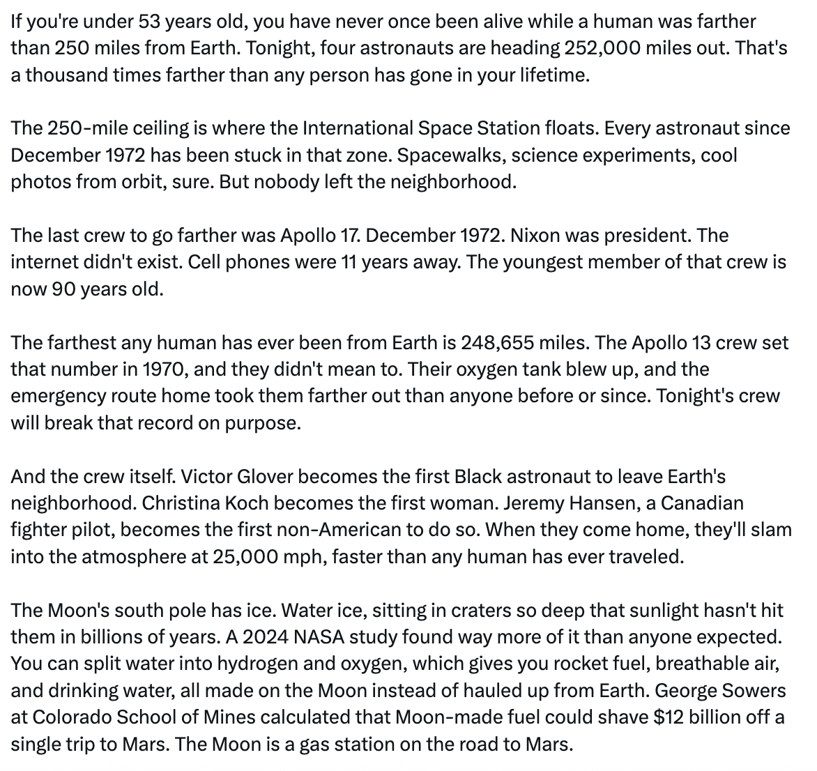“If you’re under 53 years old, you have never once been alive while a human was farther than 250 miles from Earth.”