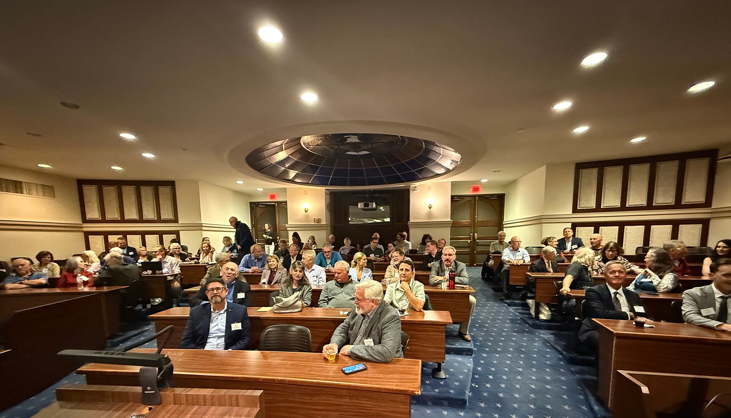 As a sign of the times, I was assigned a personal protection officer — basically a bodyguard — from the USD Police, a nice, very fit-looking fellow who was good at his job. Not quite my first time having a bodyguard at a speaking event, but it really tells you where we are these days. He shadowed me through the speech and the dinner that followed, explaining in advance the primary, secondary, and tertiary routes of egress if things went south.
